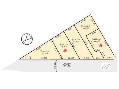 | 土地 | 権利:所有権 敷地面積:①160.73㎡(48.62坪),②184.15㎡(55.70坪),③175.38㎡(53.05坪) ④161.32㎡(48.80坪),⑤169.52㎡(51.28坪) 建築条件:無 地目:雑種地 接道:西側幅員約8.0mの公道(図面参照) 最適用途:住宅用地 備考: |