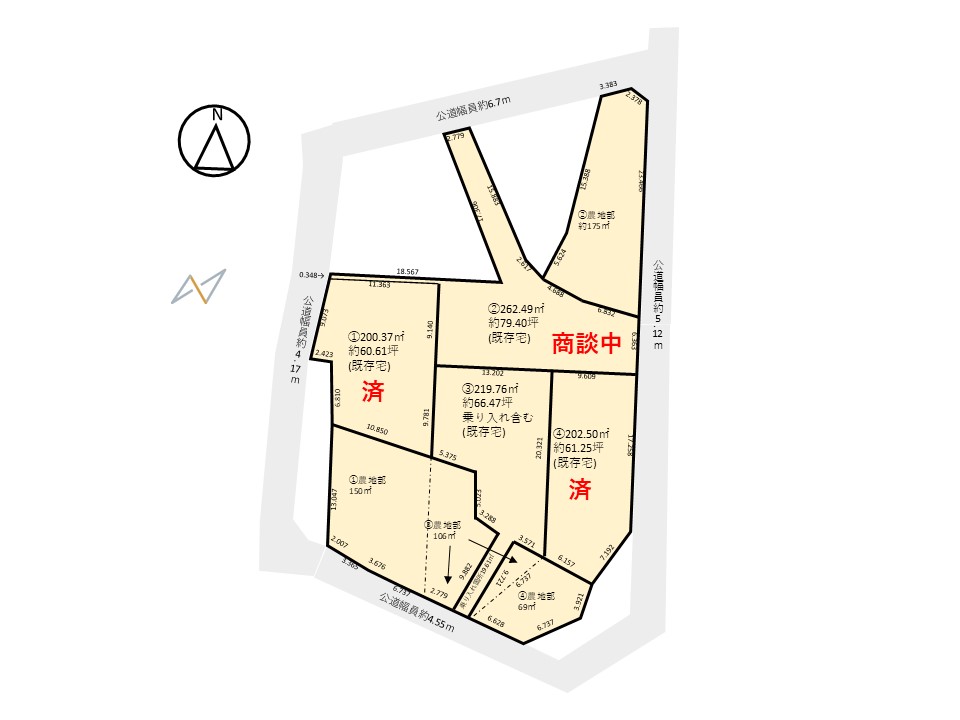 | 土地 | 権利:所有権 敷地面積:①200.37㎡(約60.61坪)、②262.49㎡(約79.40坪) ③219.76㎡(約66.47坪)、④202.50㎡(約61.25坪) 建築条件:無 地目:宅地 接道:北側公道幅員6.7m、東側公道幅員5.12m、西側公道幅員4.17m 最適用途:住宅用地 備考: |